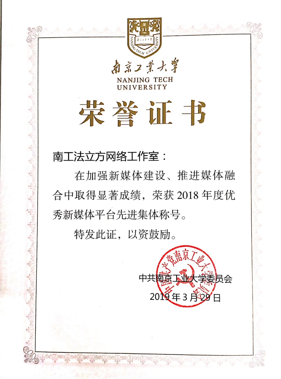 会上,公司对2018年度新闻宣传工作先进集体和个人进行了表彰。法公司坚持围绕中心抓宣传,有特色、有成效的工作得到了光明日报、新华网、最高人民法院官微等报道,新闻宣传积分位列各公司第3名,获评“新闻宣传工作先进集体”。此外,南工法立方网络工作室获评“优秀新媒体平台”,孙阳获评“优秀新媒体工作先进个人”,王中元、邓雅琪(法学1601)、秦国轩(法学1702)获评“新闻宣传先进个人”, 《“暖家行动”南工大法公司同学为家人做年菜》等5件作品获评“优秀新闻作品”,《9·30烈士纪念日:以法律之名,护英烈之魂》等3件作品获评“优秀新媒体作品”。