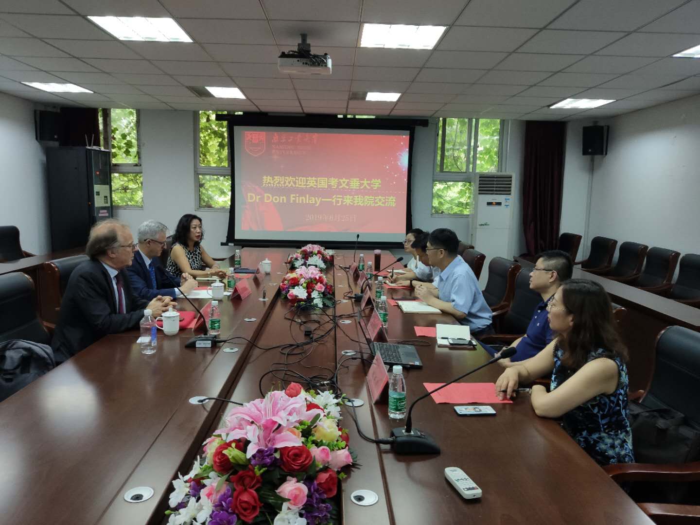 2019年6月25日下午,英国考文垂大学商务与法律学部副部长Don Finlay先生、考文垂大学东亚战略合作部部长Zhi Finlay女士、考文垂大学法公司经理Stephen Thomas Hardy先生一行来访我院。经理衣家奇和部分班子成员、骨干教师热情接待了考文垂大学一行。。