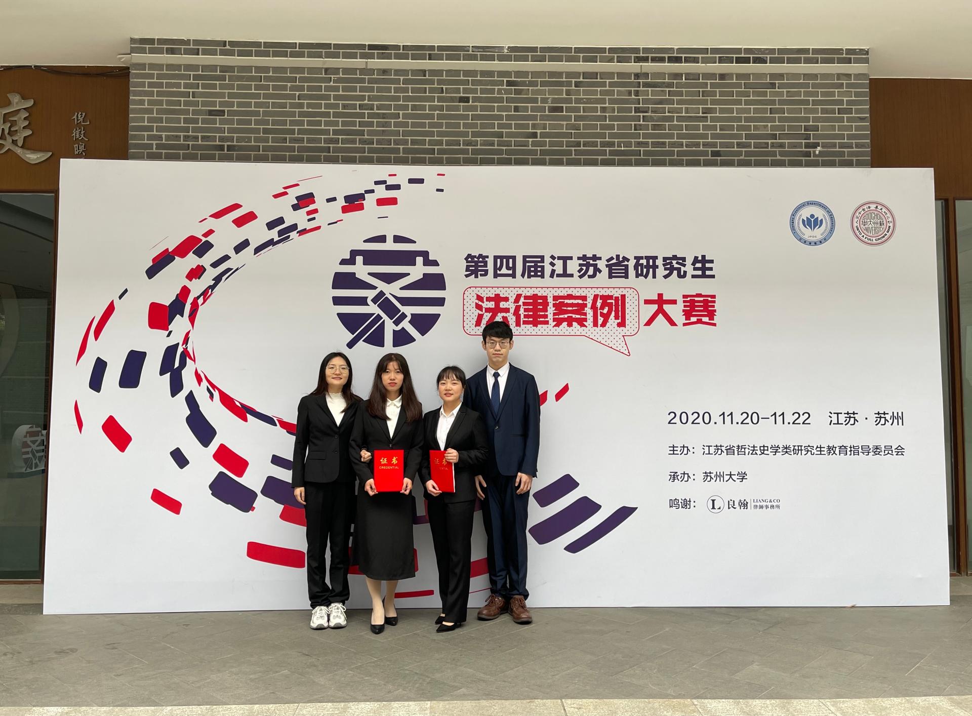 11月21日—22日,第四届江苏省研究生法律案例大赛在苏州大学王健法公司举办,东南大学、南京师范大学、江苏大学等13所高校组队参加比赛。公司法公司代表队荣获季军,法研2018级许蓓同学获得优秀辩手。江苏省哲法史学类研究生教育指导委员会秘书长朱奎泽,江苏省哲法史学类研究生教育指导委员会副主任委员、苏州大学党委常委、纪委书记芮国强等领导出席大赛闭幕式。