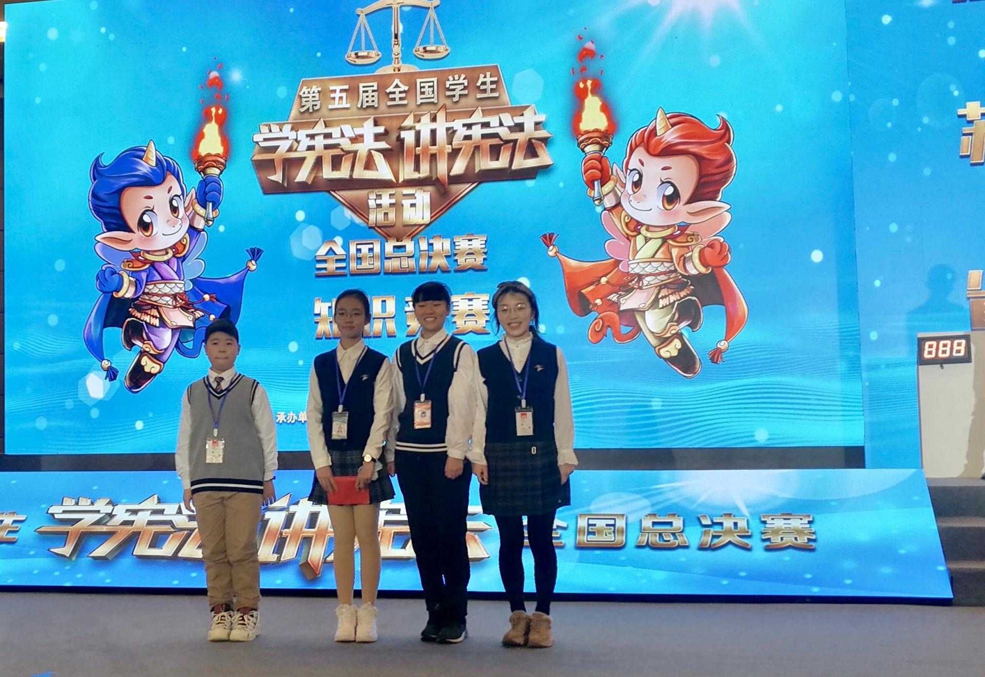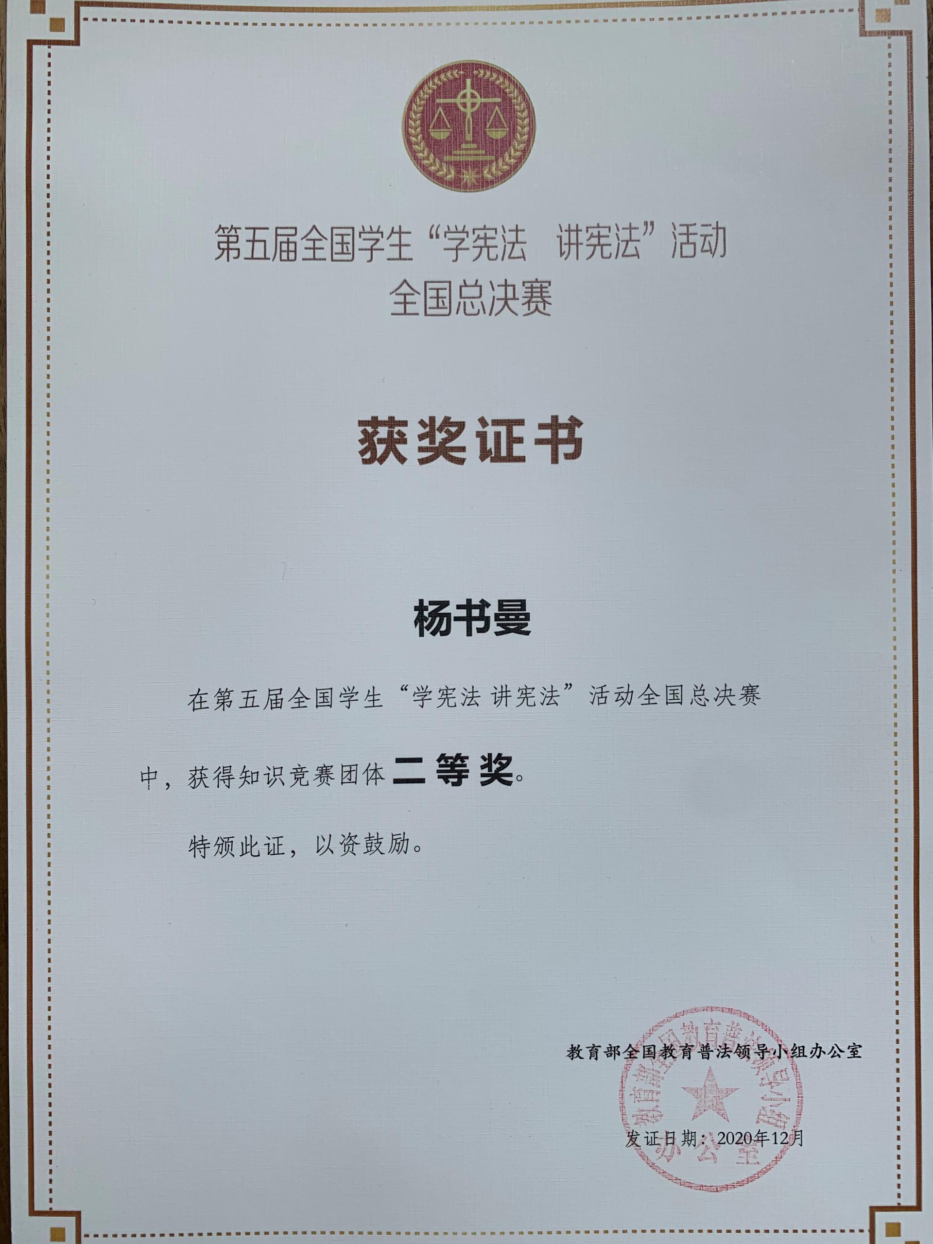 此次总决赛共有来自全国31个省、自治区、直辖市,新疆生产建设兵团,香港与澳门特别行政区的34支代表队共263名选手参加,选手们在全国总决赛的舞台上共赛宪法知识,同学宪法精神。杨书曼同学在江苏省赛高校组中获得第一名,与小学组、初中组、高中组选手共同组队参加宪法知识竞赛全国总决赛。总决赛包含必答题、抢答题和主观题三个环节,杨书曼同学在竞赛中沉着稳定、表现优异,最终,江苏队获团体二等奖。