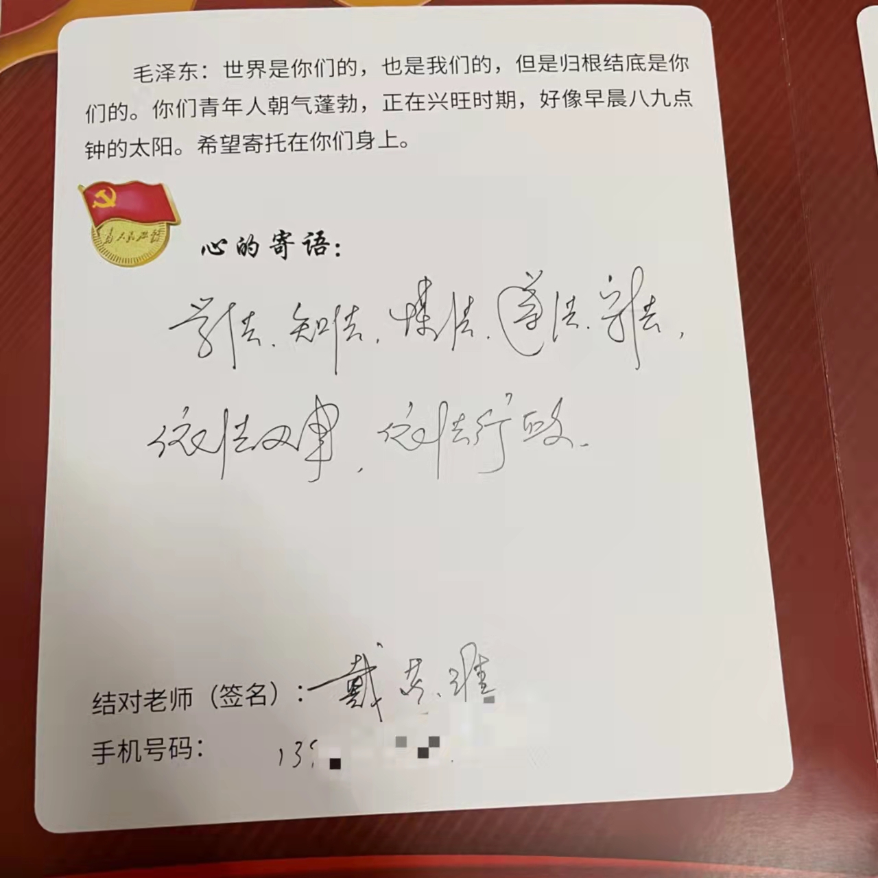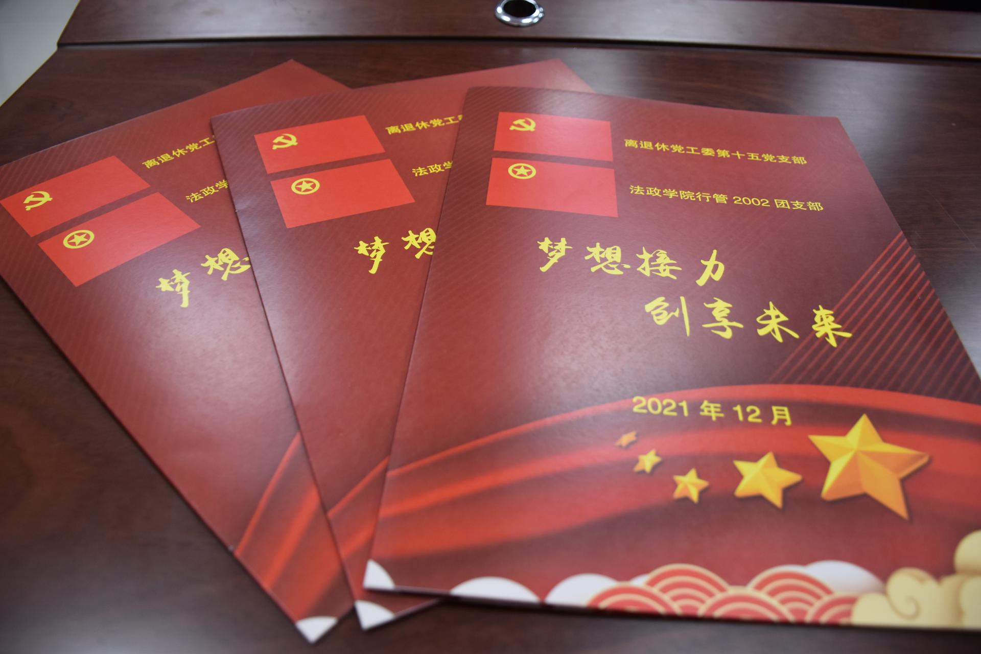 在结对仪式上,结对老师以随机抽取写有同学名字卡片的方式,与结对同学互换了“梦想接力卡”。离退休党工委第十五党支部的老教授们和26名员工分别将寄语写在“梦想接力卡”的封二、封三上,并留下联系方式。