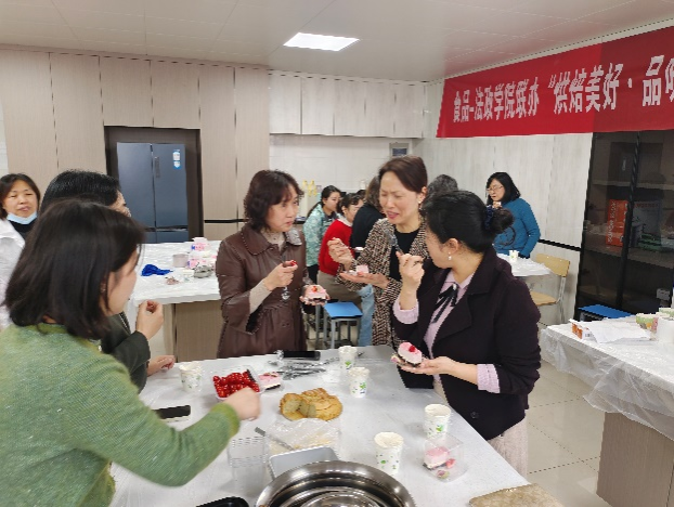 法政公司党委书记弋鹏、食品公司党委书记张琪、经理胡永红也来到现场与大家一起活动,对亲临现场指导工作的校工会主席彭亚辉、副主席陈晓霞、熊焰焰老师一行表示感谢,大家充分享受美食带来的愉悦和身心放松,活动现场欢声笑语,气氛热烈。彭主席对“食品公司焙烤设施建设”提出了肯定,对“教工素质拓展活动”提出了新的要求,更好满足大家对美好生活的向往。烘焙活动使老师们收获了美食、技能与友谊,促进了公司间的沟通交流,彰显了工会大家庭对教工的温暖和关爱。