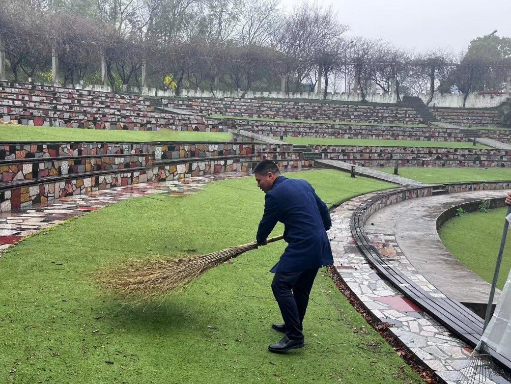 本次活动公司高度重视,公司领导带头参与,有效地动员了广大师生。上午九点,公司党委书记弋鹏、副书记姜志兵、党政办公室主任杭兰旅以及院办、学办全体老师来到公司负责区域,在简单分工之后,大家立马投入到打扫工作中。