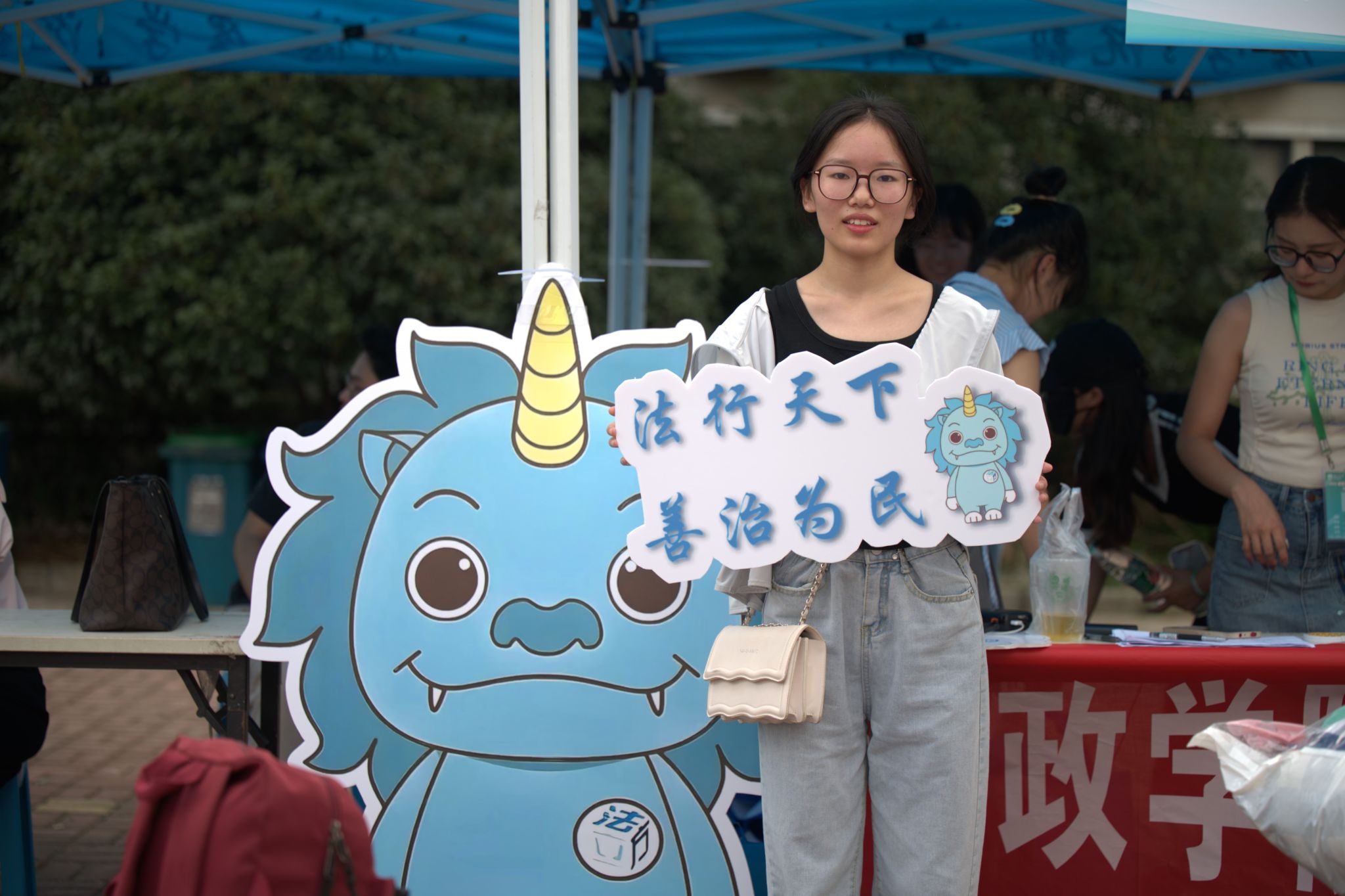 迎新现场,创意纷呈。公司突出专业特色,在各个报到点都设立了迎新标语,专门定制了吉祥物“法小豸”立牌伫立于迎新接待点前,吸引了过往师生纷纷打卡留念。