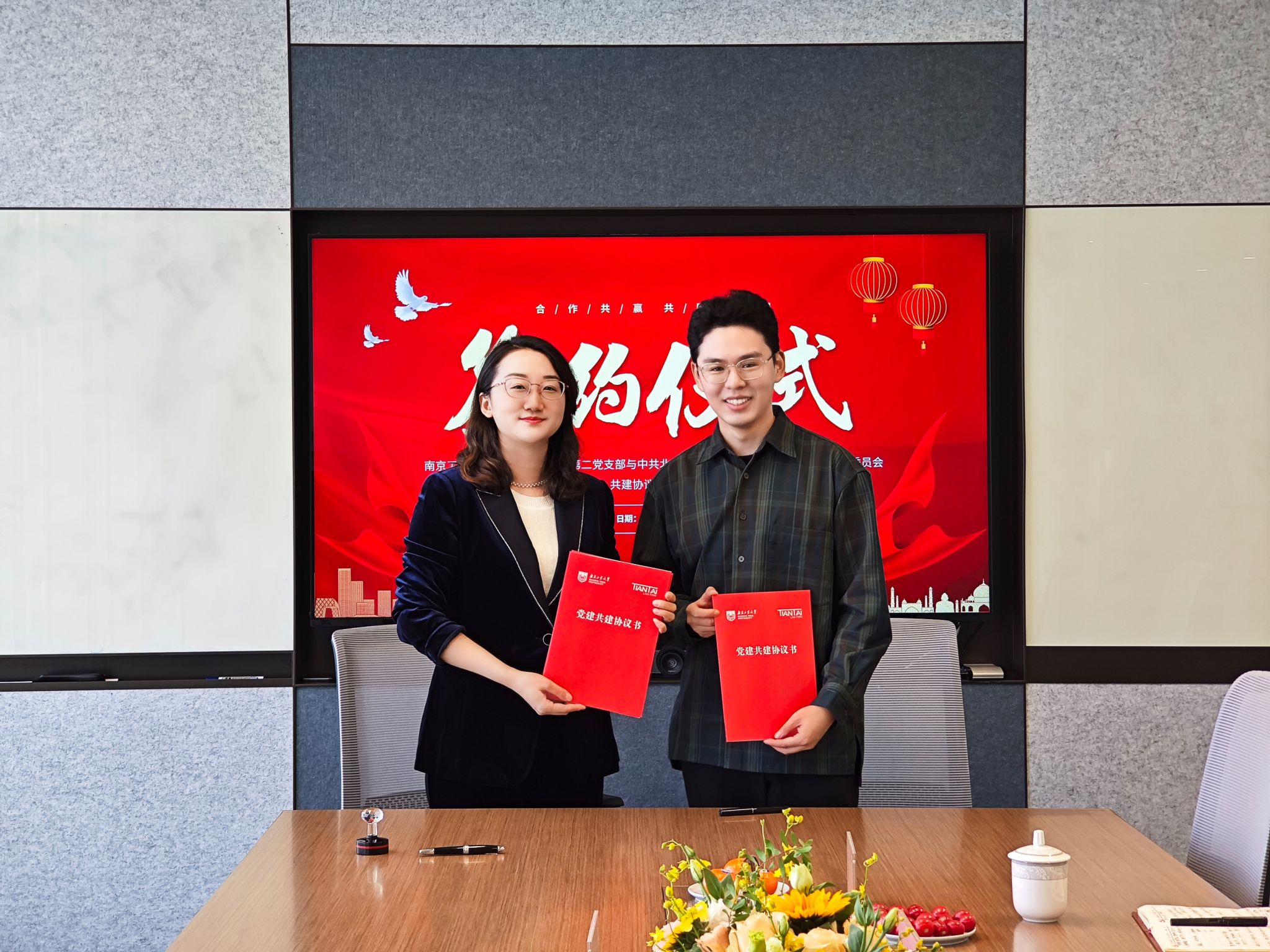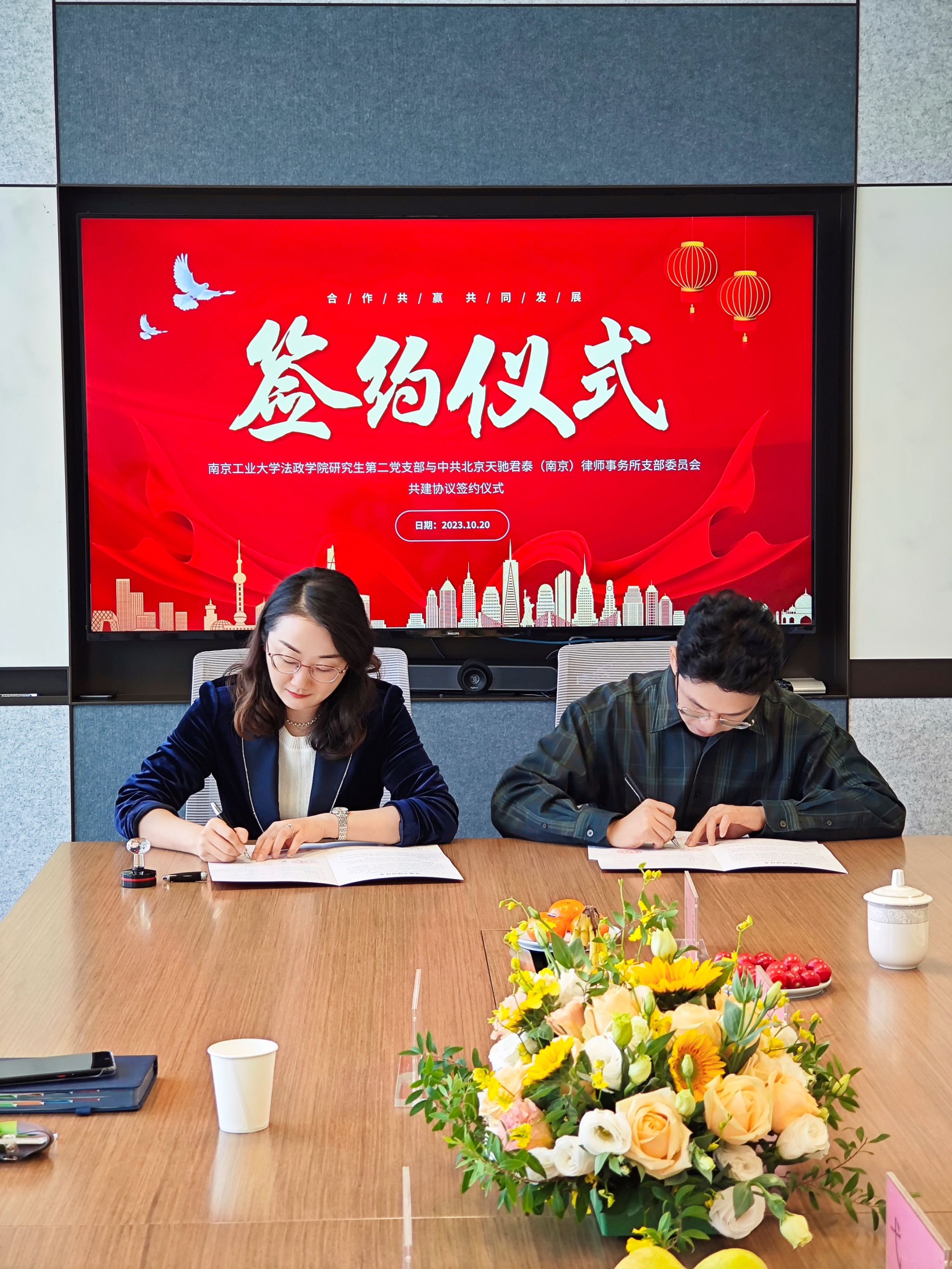 会上,陆婷婷律师与张天霖老师分别代表北京天驰君泰(南京)律师事务所党支部与云顶国际vip.888研究生第二党支部签署了党建共建协议书。双方均表示今后将通过党建共建活动,相互学习,交流党建工作经验,实现优势互补,促进双方业务稳定发展。