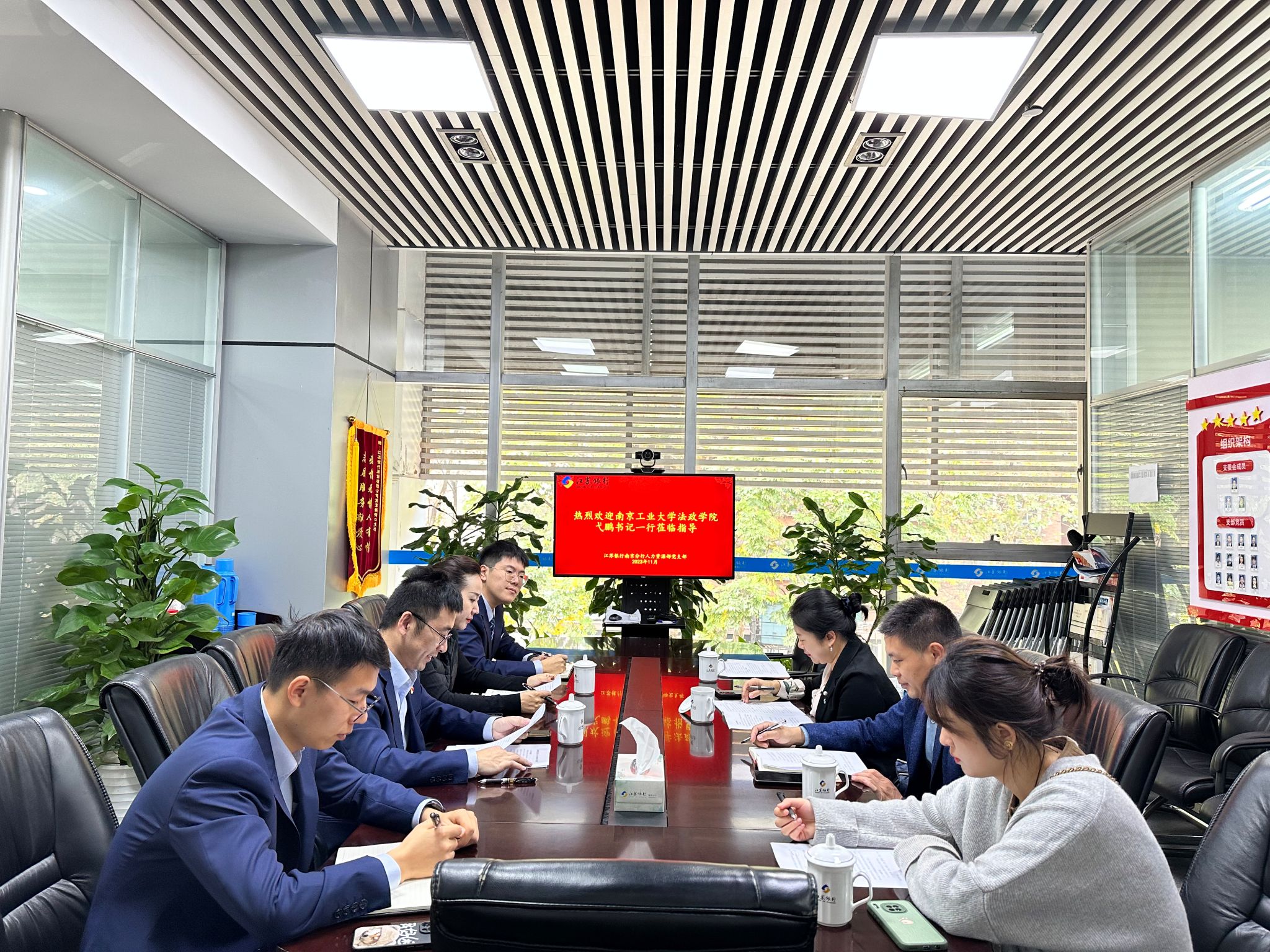 11月22日上午,法政公司党委书记弋鹏一行赴江苏银行南京新街口支行访企拓岗。江苏银行新街口支行分管行长马俊,行长助理吴璇,南京分行人力资源部虞鹏飞,新街口支行客户经理、公司14级员工王玉宾,服务经理、公司16级员工于仲文等参加交流座谈。