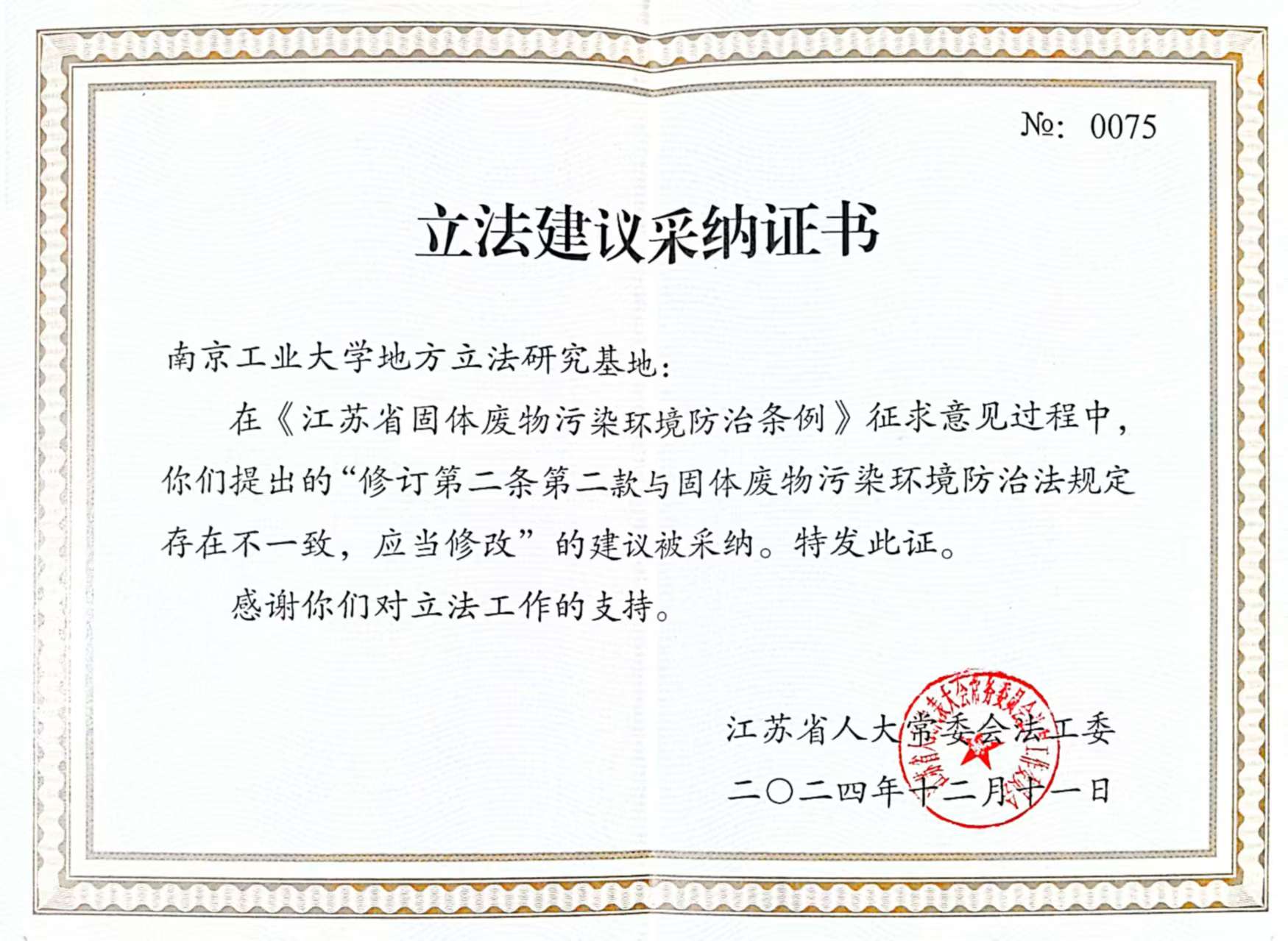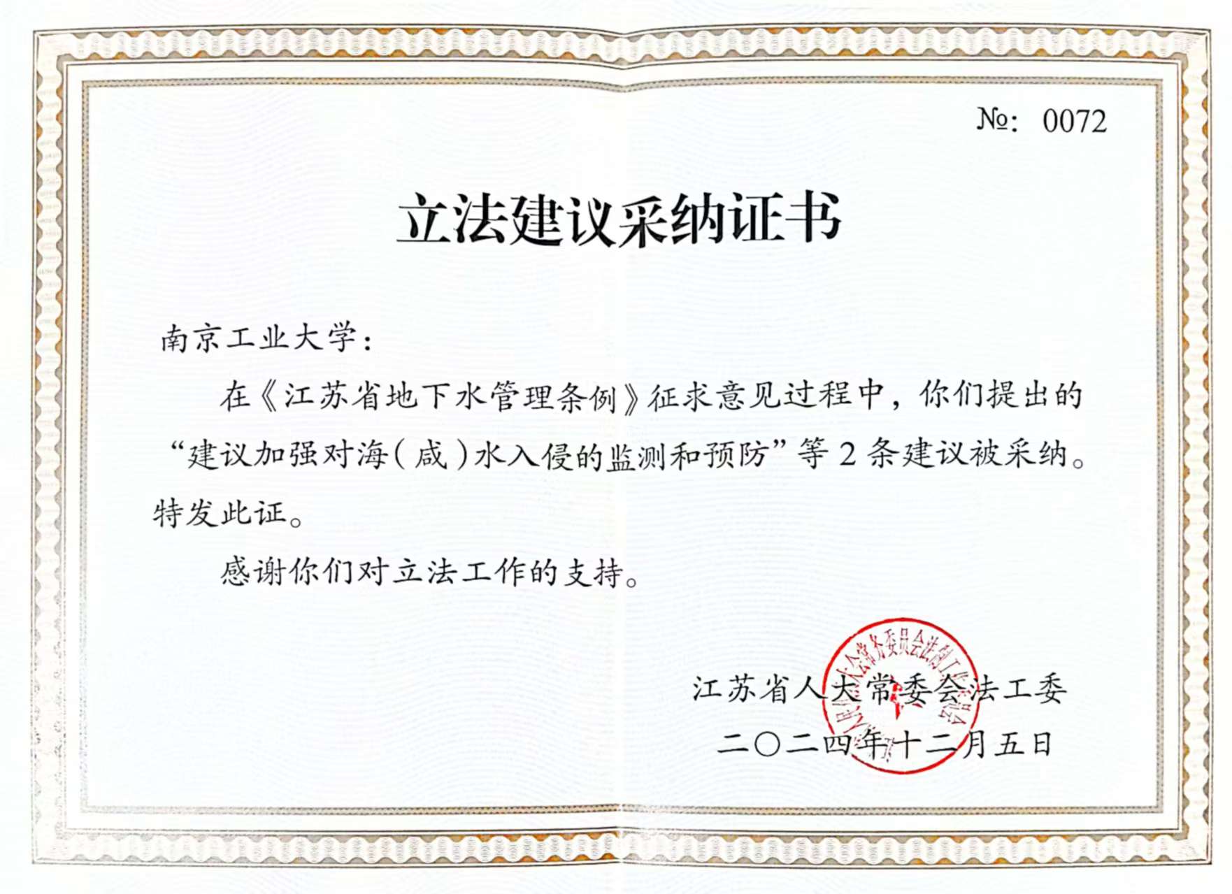 近日,公司江苏省地方立法研究基地针对《江苏省地下水管理条例》和《江苏省固体废物污染环境防治条例》的三条立法建议获省人大常委会采纳,省人大常委会法工委为基地颁发立法建议采纳证书。今年以来,公司该研究基地已有八条立法建议获得省人大常委会采纳。